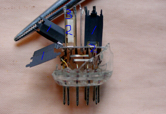 1:阳极;2:栅极,栅极里白色部分是栅极和阴极的绝缘层;3 就是阴极,这是个扁型金属管,灯丝就包在里面啦。
