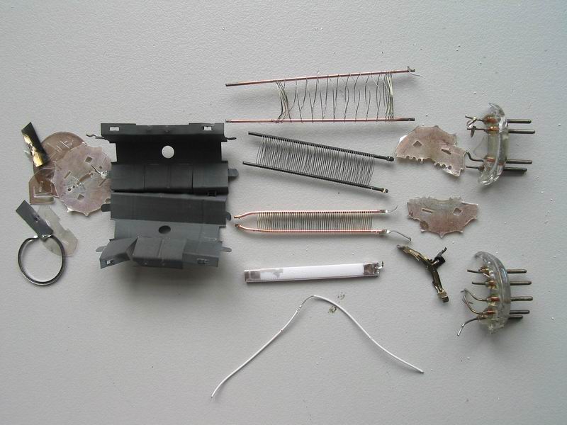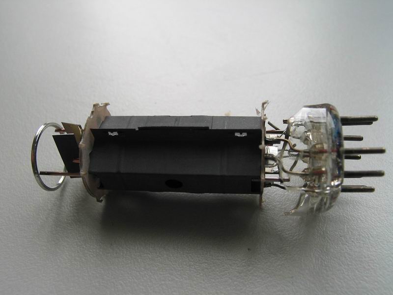 这是颗用于高频放大的通用双三极管6N1。1是吸气剂;2是灯丝阴极和栅极的组合体;3就是阳极。